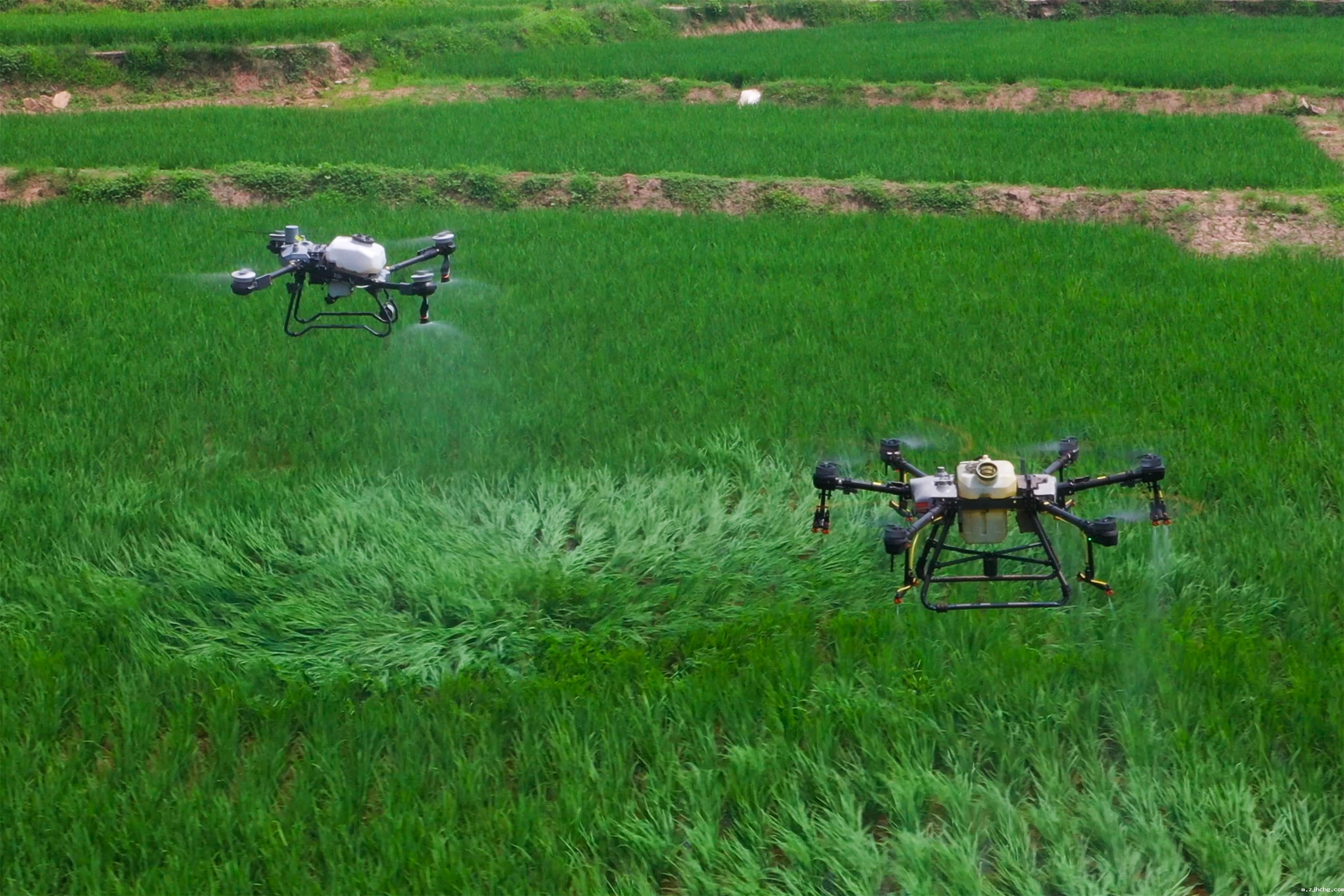 无人机为水稻喷洒防范病虫害的药品。夏娟 摄