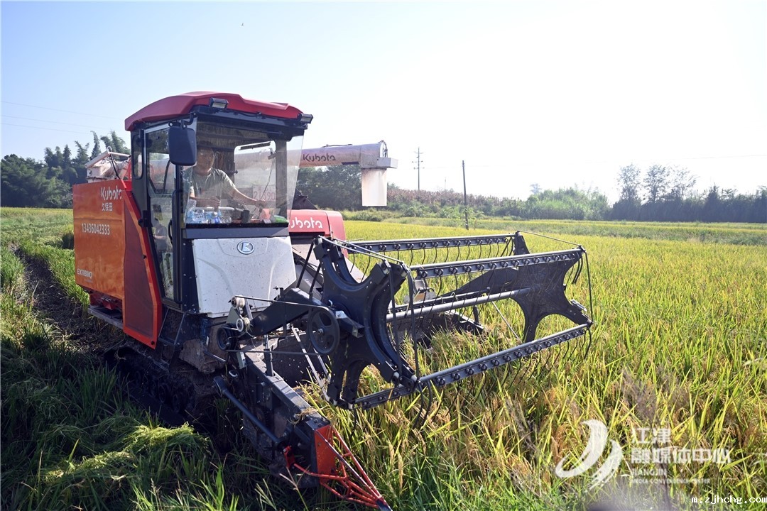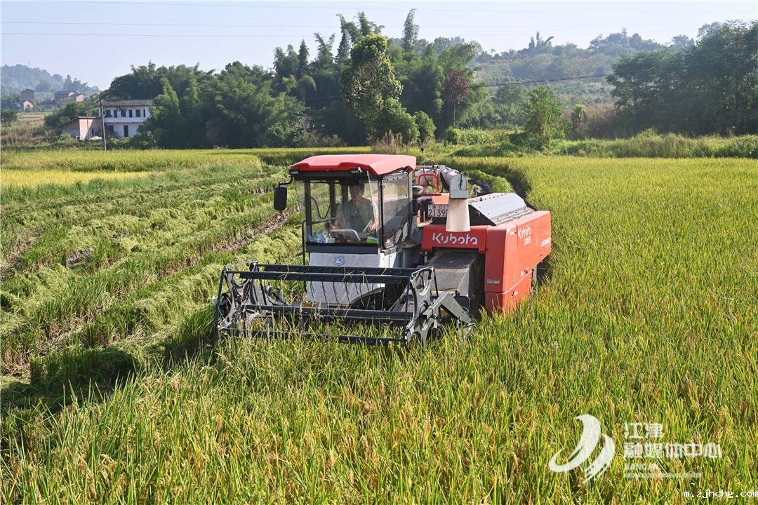 负责种植这些稻田的重庆市江津区龙坪水稻种植家庭农场负责人傅世法介绍:“水稻收割采用的是大型收割机,收一亩稻田仅需12至16分钟,整个过程省时又省力。”
