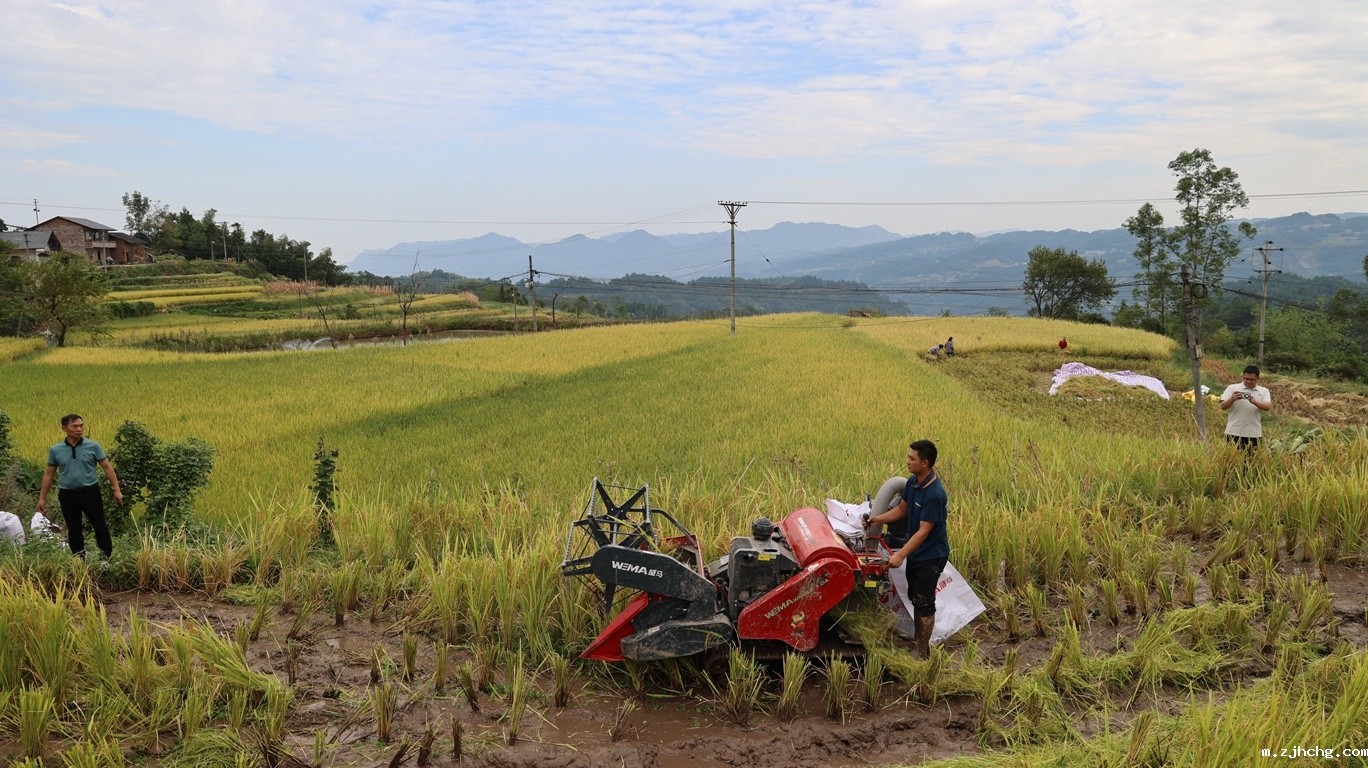 9月2日,四屏镇旺龙村,随着一阵轰鸣声由远及近,小型丘陵收割机开进了这个宁静的村落。