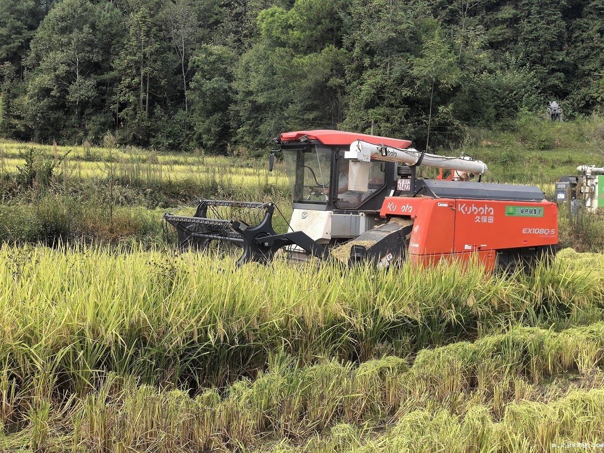 今年,重庆宜稼欣农业集团有限公司在白土镇流转土地5000余亩,用于种植水稻,目前水稻已经进入成熟季,公司派出4台收割机进行收割,每天能收割稻谷150亩。