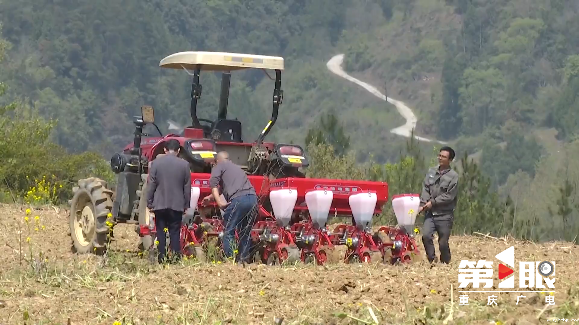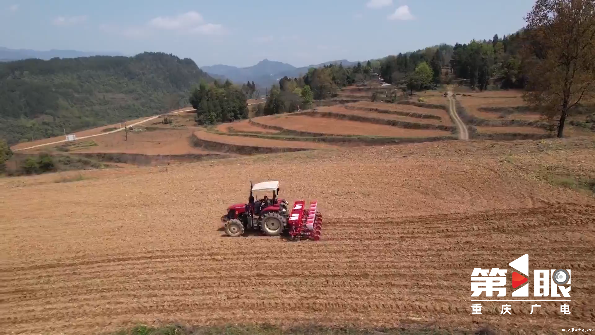 在黔江区石家镇火石垭大豆玉米带状复合种植示范片,新翻犁的土地整齐划一分布在山间。机器轰鸣中,大型播种机开足马力驰骋在田间,大地上一道道“五线谱”奏响了春耕“协奏曲”。