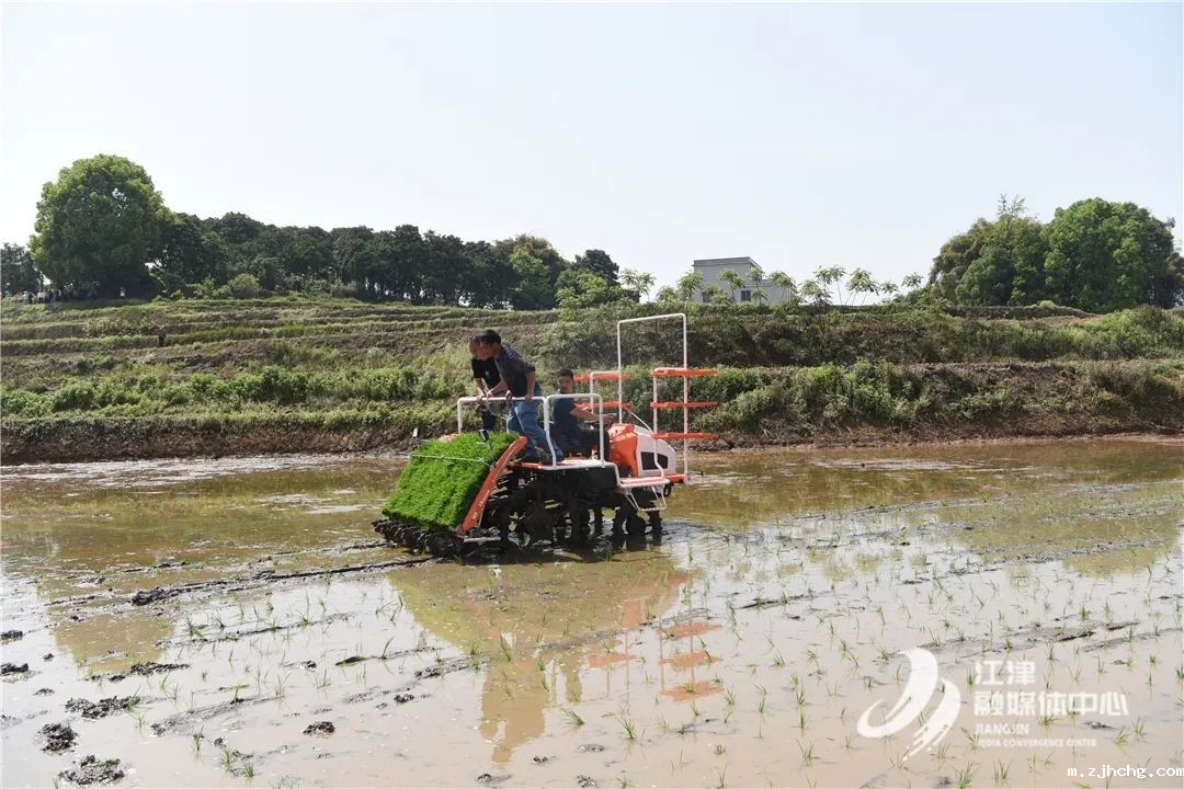 “哇,这机械好大块头,插秧速度好快……”围观村民发出一声声赞叹声。只见在一块水田中,农机手操作着乘坐式插秧机在平整的水田里来回穿梭,一簇簇绿油油的秧苗被整齐均匀地插在水田中,速度非常快,水田很快就现出满满绿意。