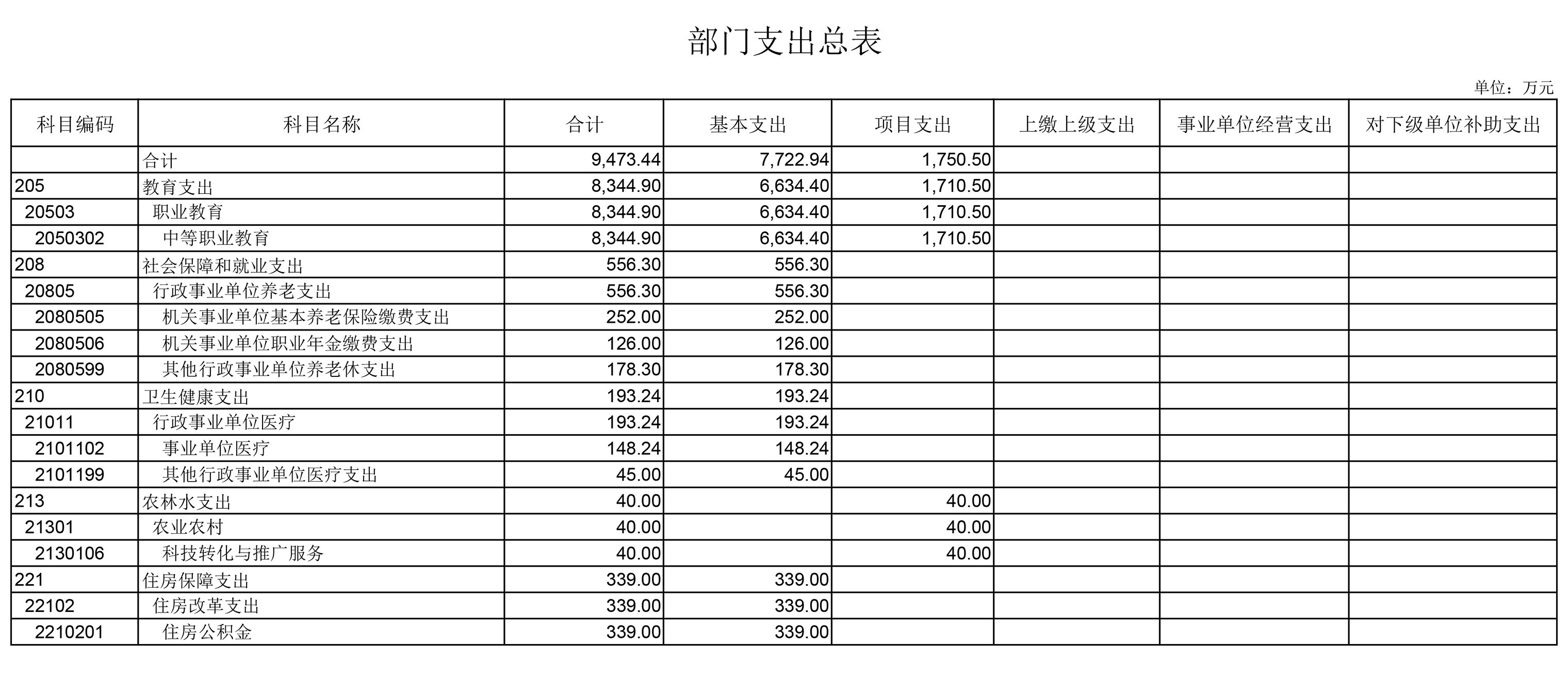 (二)支出预算:2021年年初预算数9473.44万元,其中:一般公共服务支出预算0万元,教育支出预算8344.90万元,社会保障和就业支出预算556.30万元,卫生健康支出预算193.24万元,农林水支出预算40万元,住房保障支出预算339万元。支出预算较2020年增加2419.68万元,主要是基本支出预算增加2419.18万元。