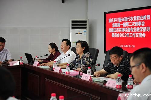 接着,重庆乡村振兴农业职教集团第一届第二次理事会暨重庆市农林牧渔专业教学指导委员会2019年度工作交流会在会议室召开。集团、农指委近30家成员单位出席会议,重庆市农业学校校长、集团理事长王华平报告了集团自筹建以来开展的工作,随后会议讨论了2019年下半年工作计划并对重庆涉农中职学校优秀论文颁奖,重庆市农业学校与重庆经贸中专还分别做了《畜牧兽医现代学徒制试点》《小班师徒制在中职学校教学中的运用》的经验交流。